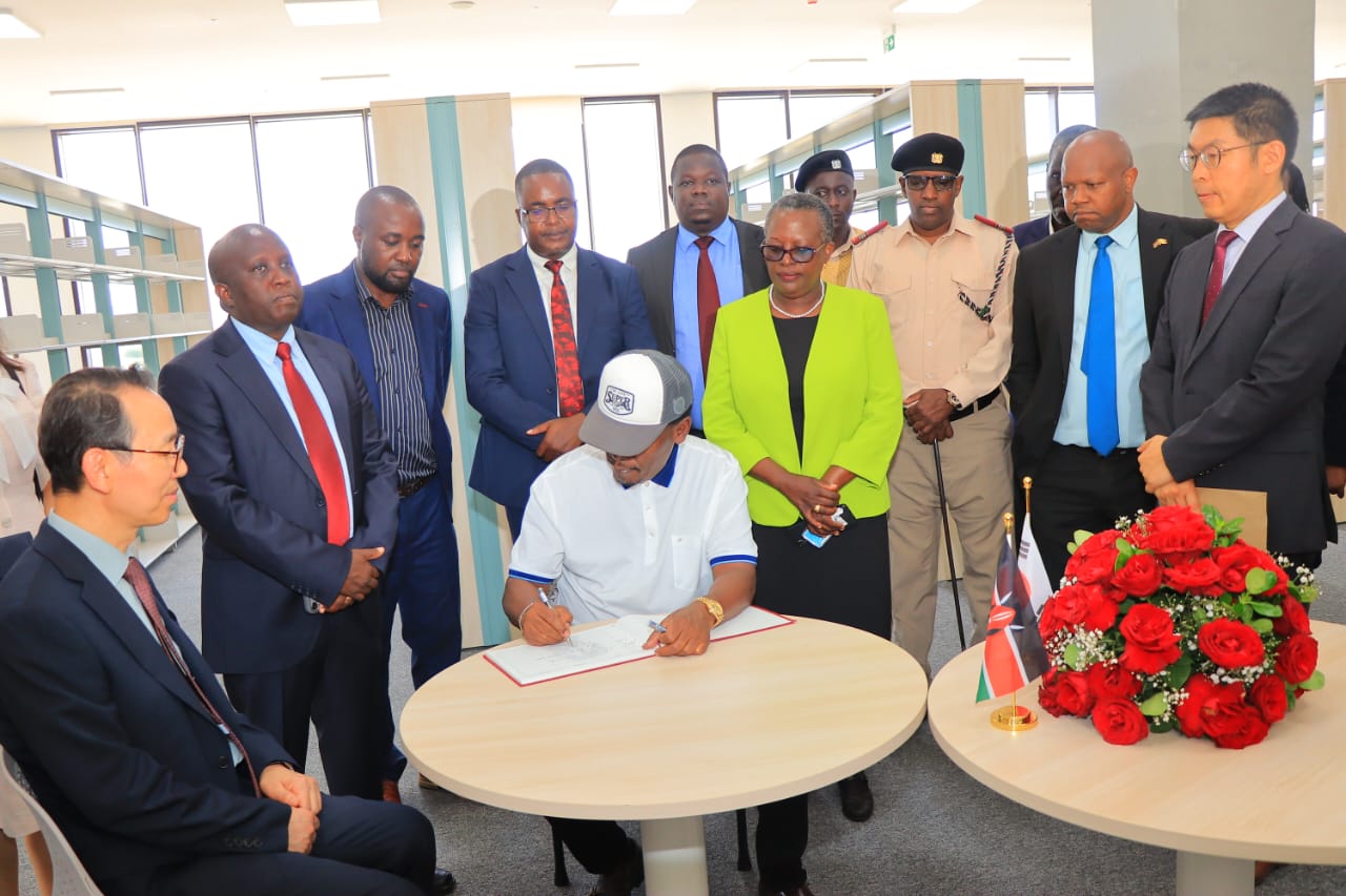 Cabinet Secretary Hon. Willliam Kabogo signs the guest book during the Celebration of Completion Event in April 2025