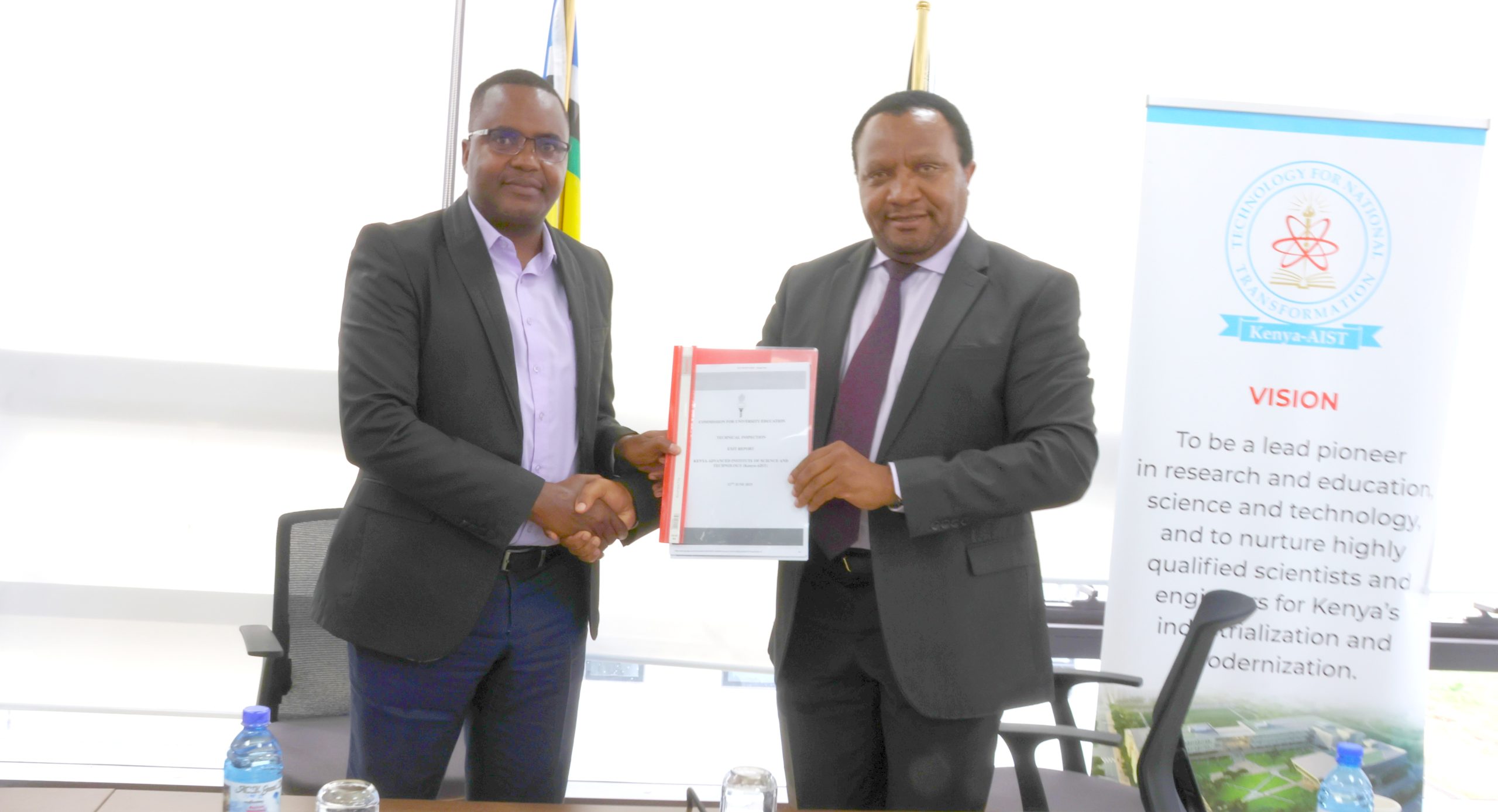Council Chairman Prof. Emmanuel Mutisya receives the Accreditation report from CUE CEO Prof. Mike Kuria in June 2025