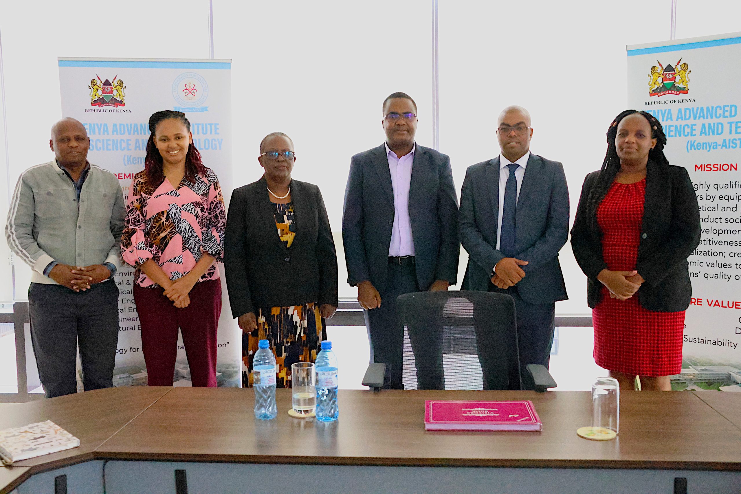 (Left to Right) Prof. Dickson Andala, CEO - National Research Fund; Prof. J. W. Khamasi, CEO – Kenya-AIST; Prof. Shaukat Abdulrazak, Principal Secretary, State Department for Science, Research & Innovation; Prof. Emmanuael Mutisya, Kenya-AIST Council Chairman; and Dr. David Ngigi, CEO - NACOSTI